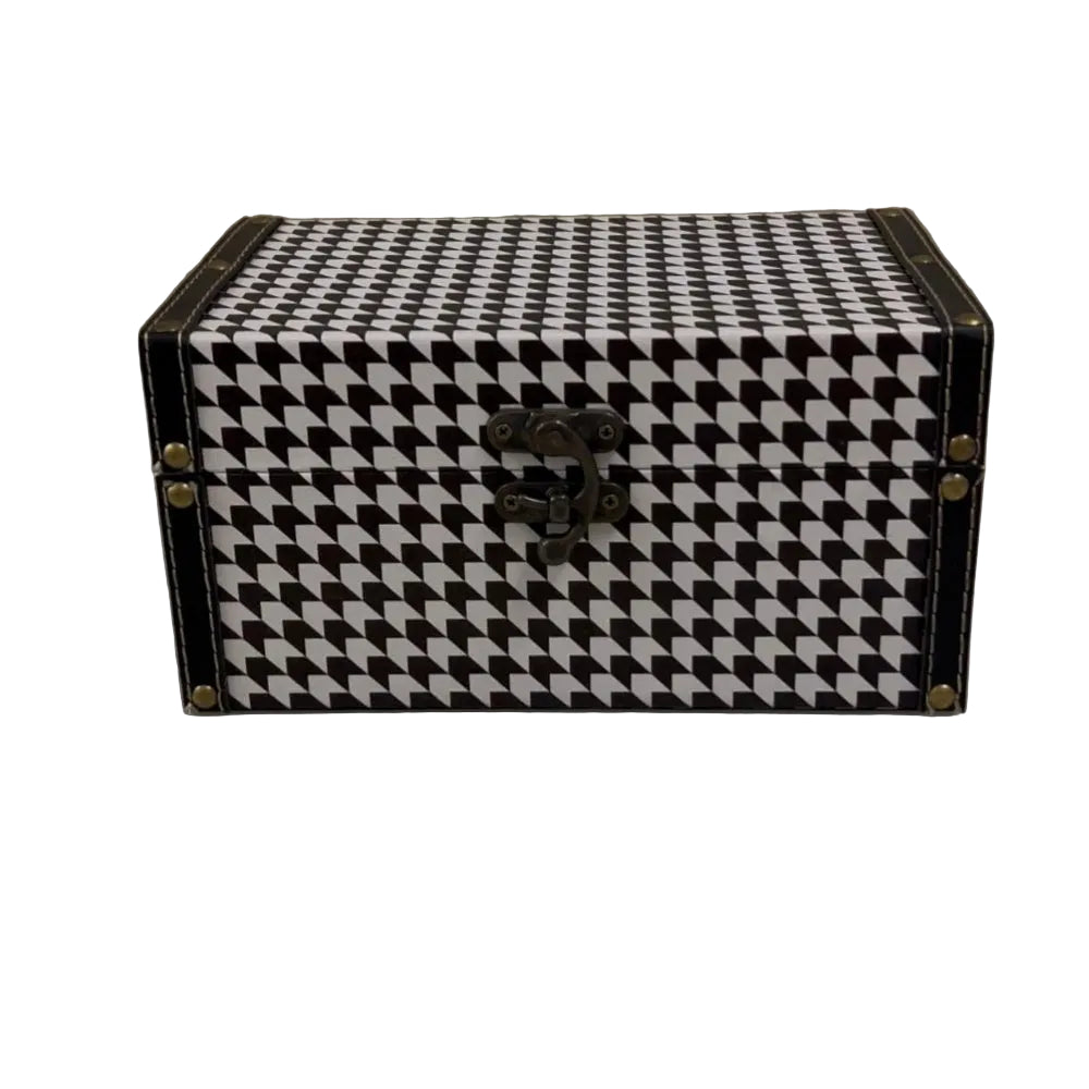 Baú em formato de mala em madeira e aplicação de material geométrico preto e branco.